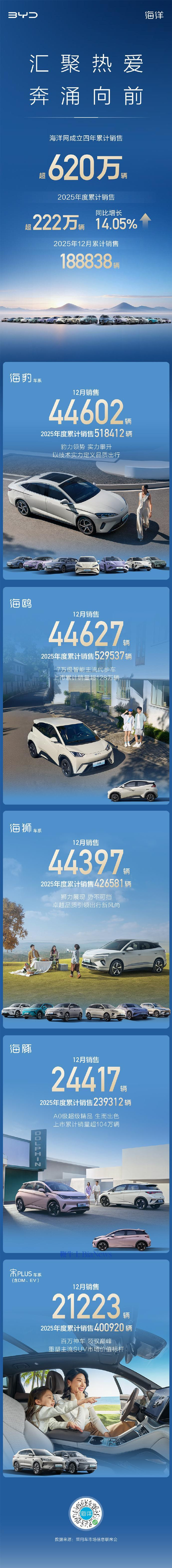 比亚迪海洋网2025年度累销超222万辆, 同比增长14.05%
