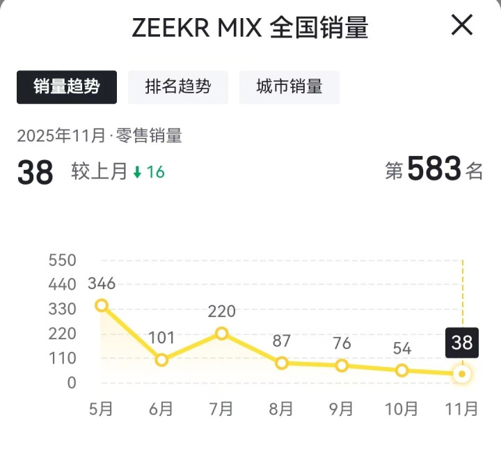 好多一又友可能齐莫得留心到,据最新的11月份销量数据统计,极氪MIX在11月只是售出去了38辆新车,排在极氪总共家眷销量的最末尾。