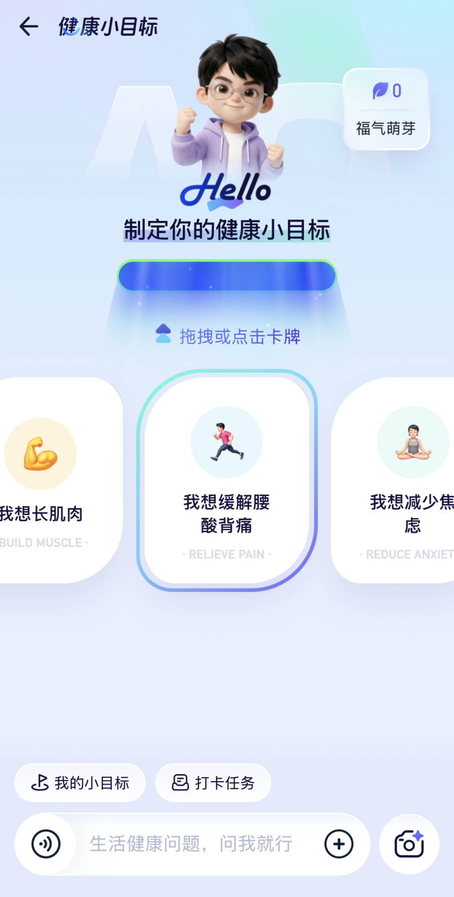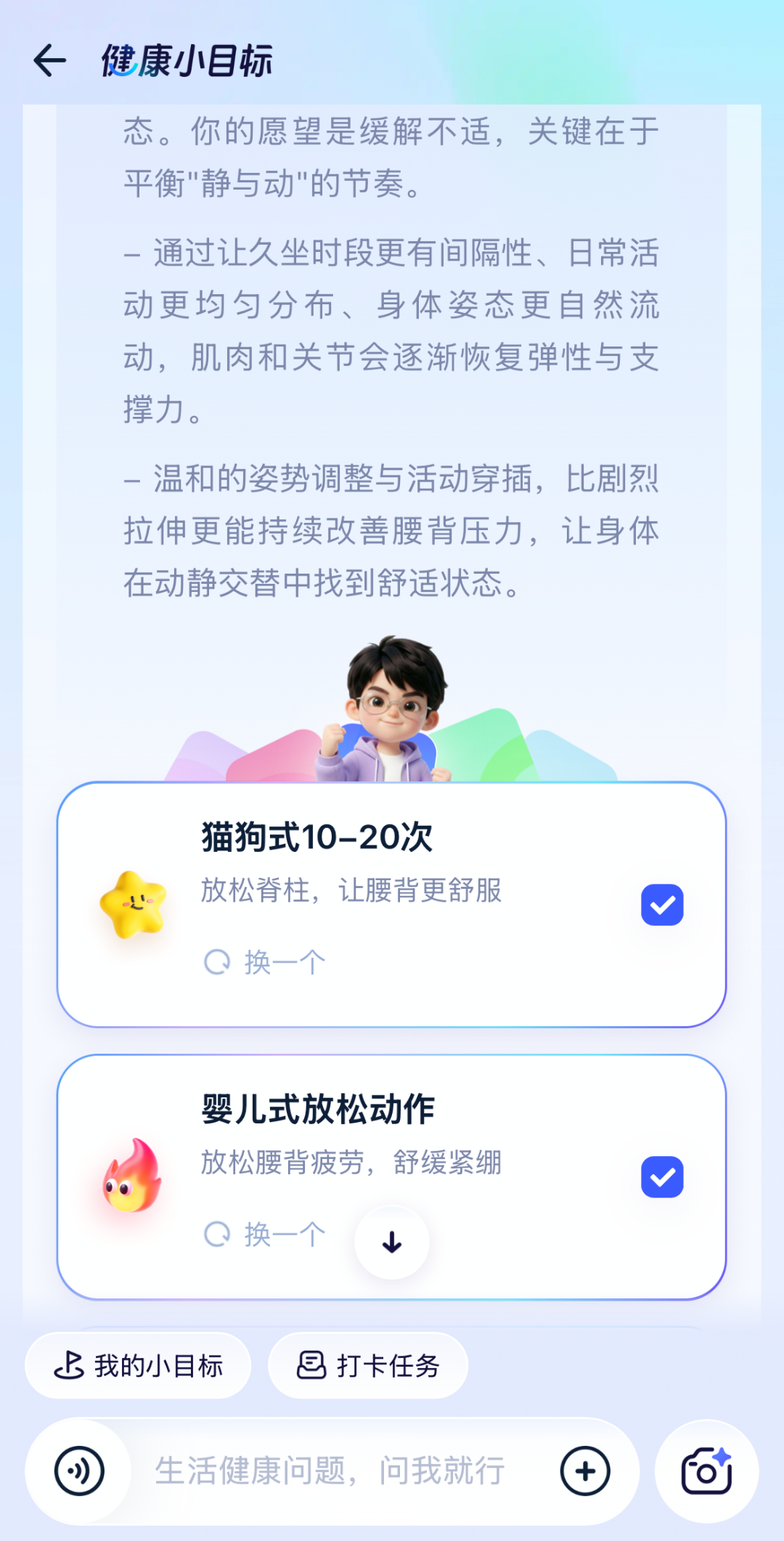“小目的”功能何如用?记者体验了一下,点击App首页的“健康小目的”,出现设定栏,记者设定“我念念缓解腰酸背痛”的小目的,阿福进一步了解发现,记者是久坐后产生酸痛,立地给出了几项打卡覆按任务,如“猫狗式10-20次”“婴儿式减弱动作”“臀桥10次”等,若是经受,阿福将逐日定时发送教导音问,教导用户坚握覆按。