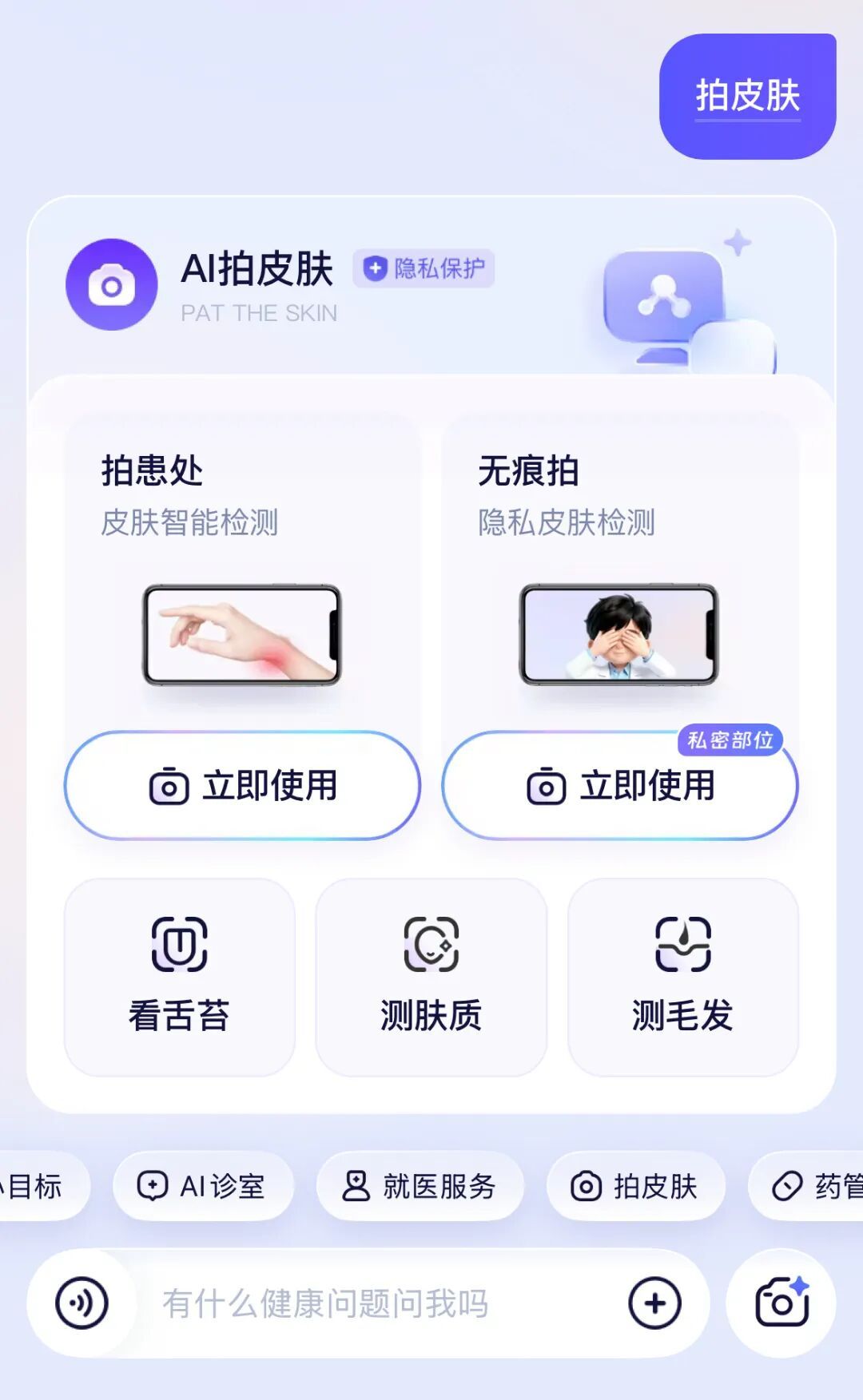 据悉,阿福“拍皮肤”能提供个性化护肤提出,也可精确识别50类常见皮肤病,“无痕拍”模式下,发问像片还能全程打码,拔除秘密顾虑。
